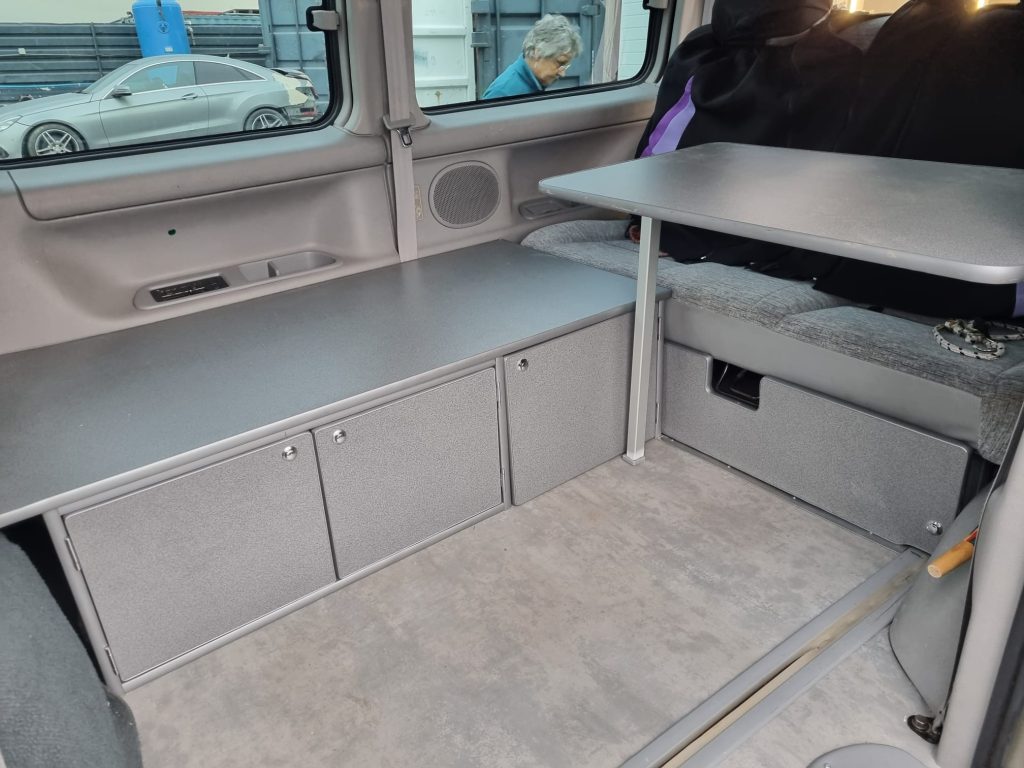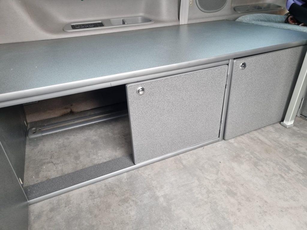 - A custom-made sleeping area with under-bed storage cupboards and a compartment for an under-bed toilet.