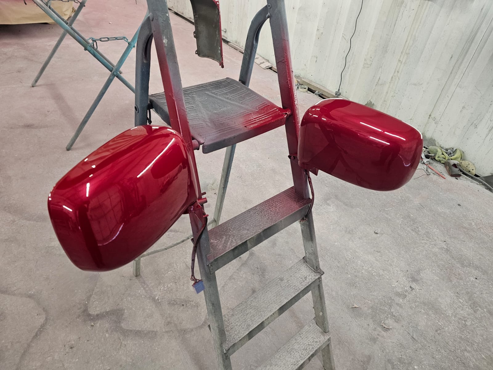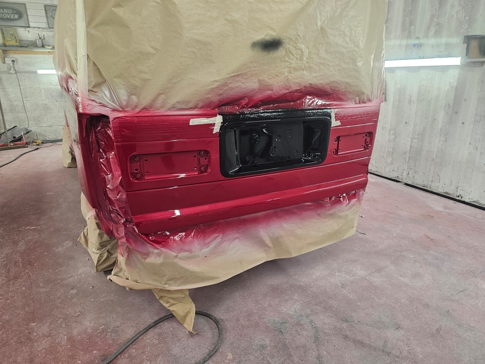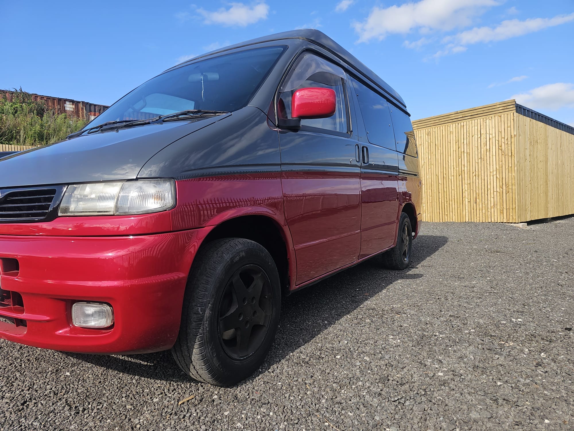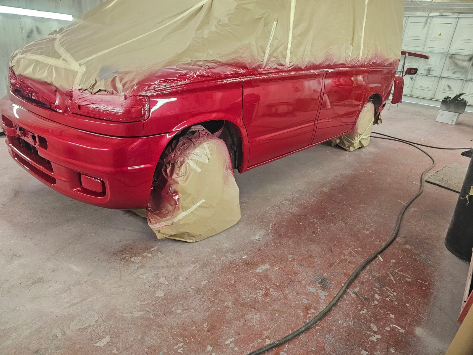 We meticulously replaced both the inner and outer rear wheel arches, ensuring that the van’s structure was fully restored. Once the structural repairs were complete, we moved on to the bodywork. The bottom half of the van was resprayed in the chosen candy red pearl, bringing a fresh, modern look to this classic vehicle. To tie everything together, we also color-coded the rear spoiler and wing mirrors, giving the Bongo a cohesive and stylish finish that’s sure to turn heads wherever it goes.