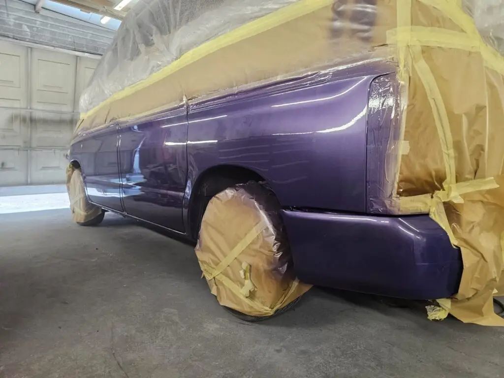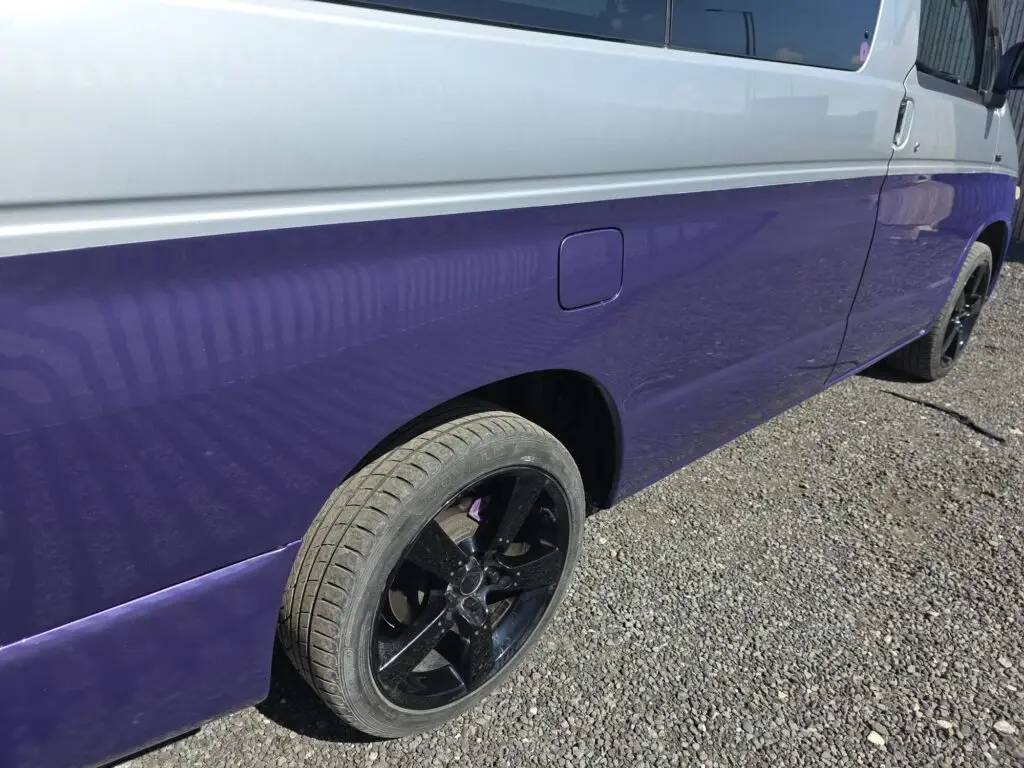 The lower half was resprayed in a metallic purple finish, giving the van a completely new identity. This colour choice adds depth, shine and a strong visual contrast against the upper half.