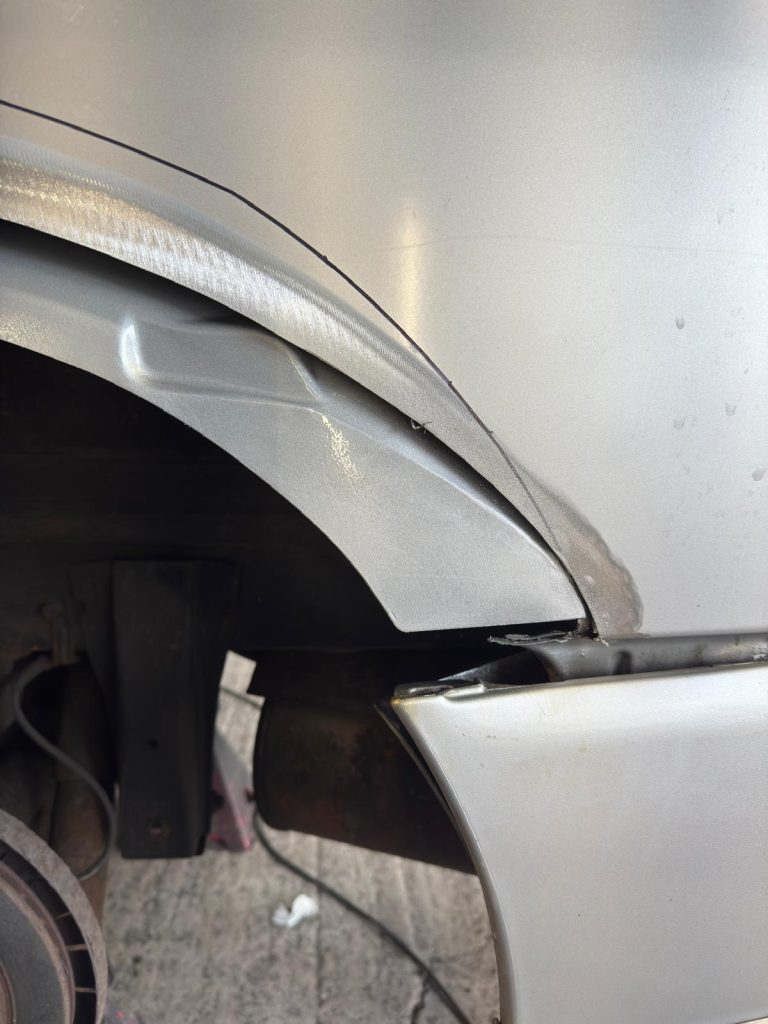 This grafting process required exceptional precision, aligning panel curves, seams, and fitting points perfectly. Once in place, we repainted the entire side in matching factory silver to seamlessly blend the repair with the original finish.