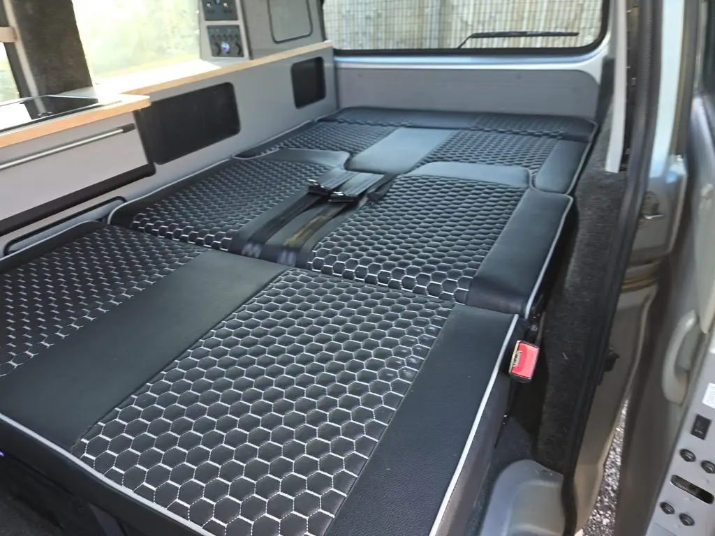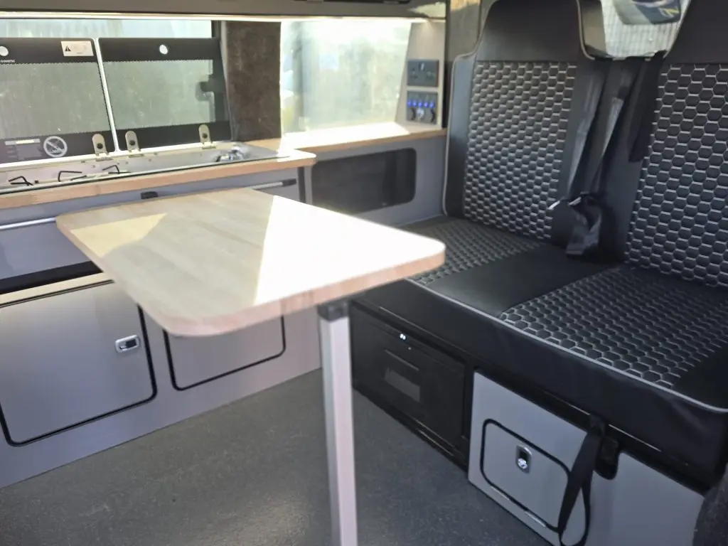 Inside, the conversion uses everything customers ask for. The ultra-wide rock-and-roll bed provides two adults with proper sleeping space. You get a gloss grey slimline side conversion with a hard oak worktop, a matching table and multiple storage compartments. The twin overhead roof lockers feature black edging and black tambour doors, keeping the look clean and modern. All sockets and fittings are finished in black, maintaining a consistent style.