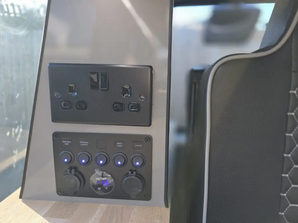 The electrical system includes a leisure battery, split charger, multiple USB ports, 12-volt lighting throughout and a full 240v hook-up with twin 240v sockets. Everything is set up for real-world use, so you can camp for long stretches without worrying about power.