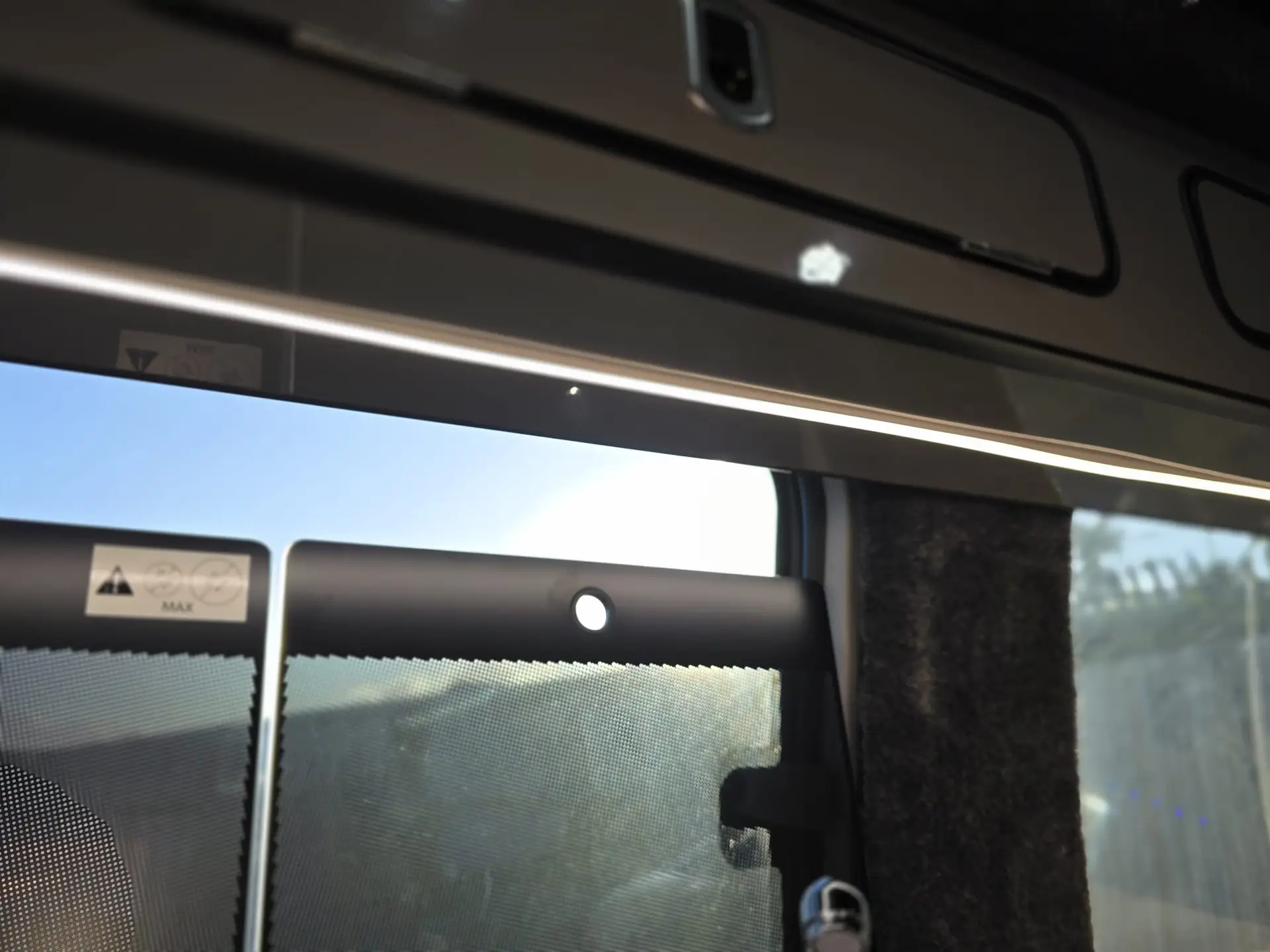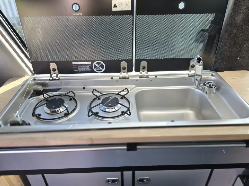 Lighting is fully upgraded. You get interior LEDs, strip lighting under the sink, strip lighting in the roof locker, main roof lights and rear reading lamps. The pop top has its own lighting, too. The fabric sides can be unzipped to let in fresh air and daylight. Door cards have been retrimmed, which adds warmth and comfort to the cabin.