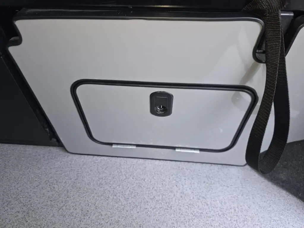 We built a slimline side unit designed around storage first. Shelves and lockers are sized for real items instead of being an afterthought. There is room for camping chairs, cooking equipment, bedding and personal kit, all tucked away rather than rolling around on the floor.
