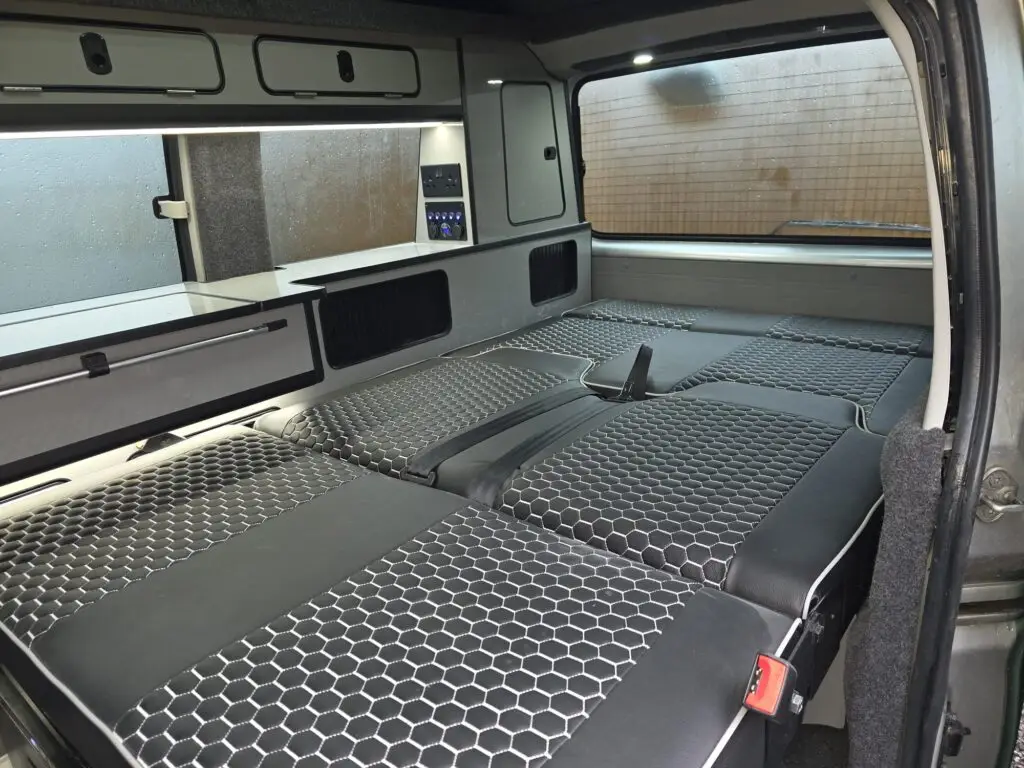 A comfortable rock-and-roll bed completes the rear, providing proper seating on the road and a supportive sleeping platform at night. With the appliances removed, the bed area feels more open and relaxed. You can move around easily, lay out bags and still have space to sit without feeling boxed in.